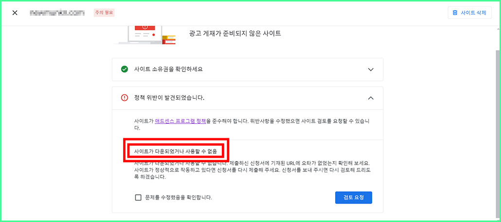 ▣ 해당 페이지에서 '문제가 수정되었음을 확인'에 '체크' 표시를 한 다음에 '검토 요청'을 눌러주세요. 그리고 사이트가 검토될 때까지 기다려주세요. 홈페이지마다 검토가 완료되는 날이 다르기 때문에 저의 경우는 수시로 확인하면서 검토가 완료되었는지 확인을 했습니다.