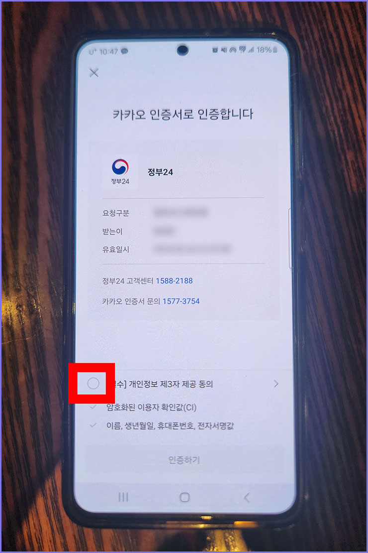 06. 카카오 인증서로 인증합니다 라는 창이 나옵니다. '약관 동의'에 체크를 해주세요.