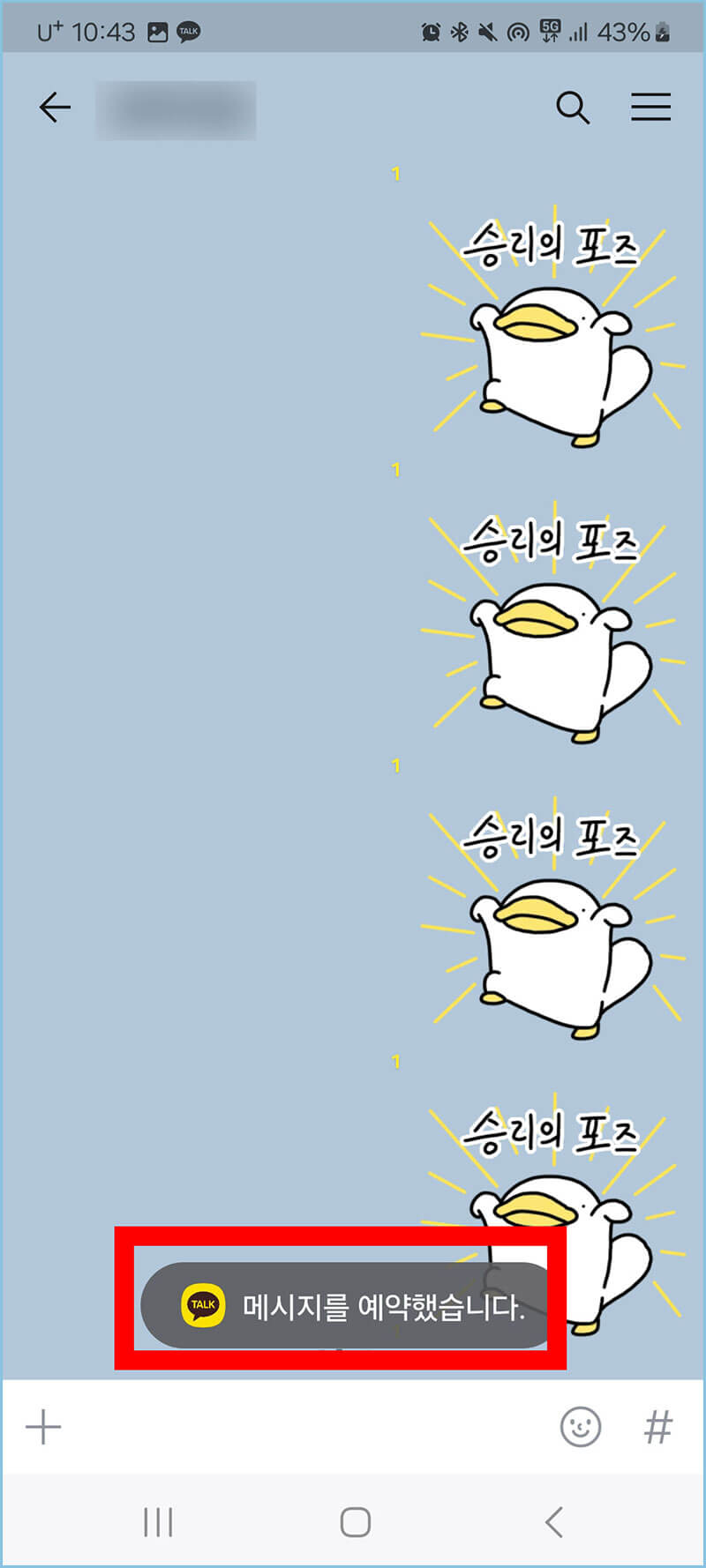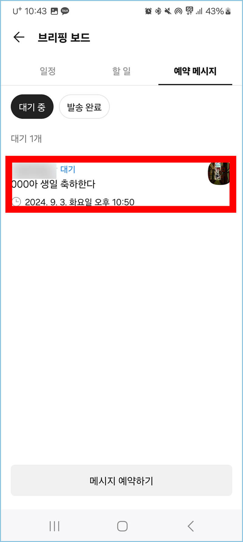 05. 여기까지 했으면 톡방에서 '문자를 예약했습니다.'라는 멘트가 나옵니다. 그러면 예약 문자 보내는 법이 모두 완료되었습니다. 이번에는 취소 및 변경하는 법에 대해서 알아보겠습니다.