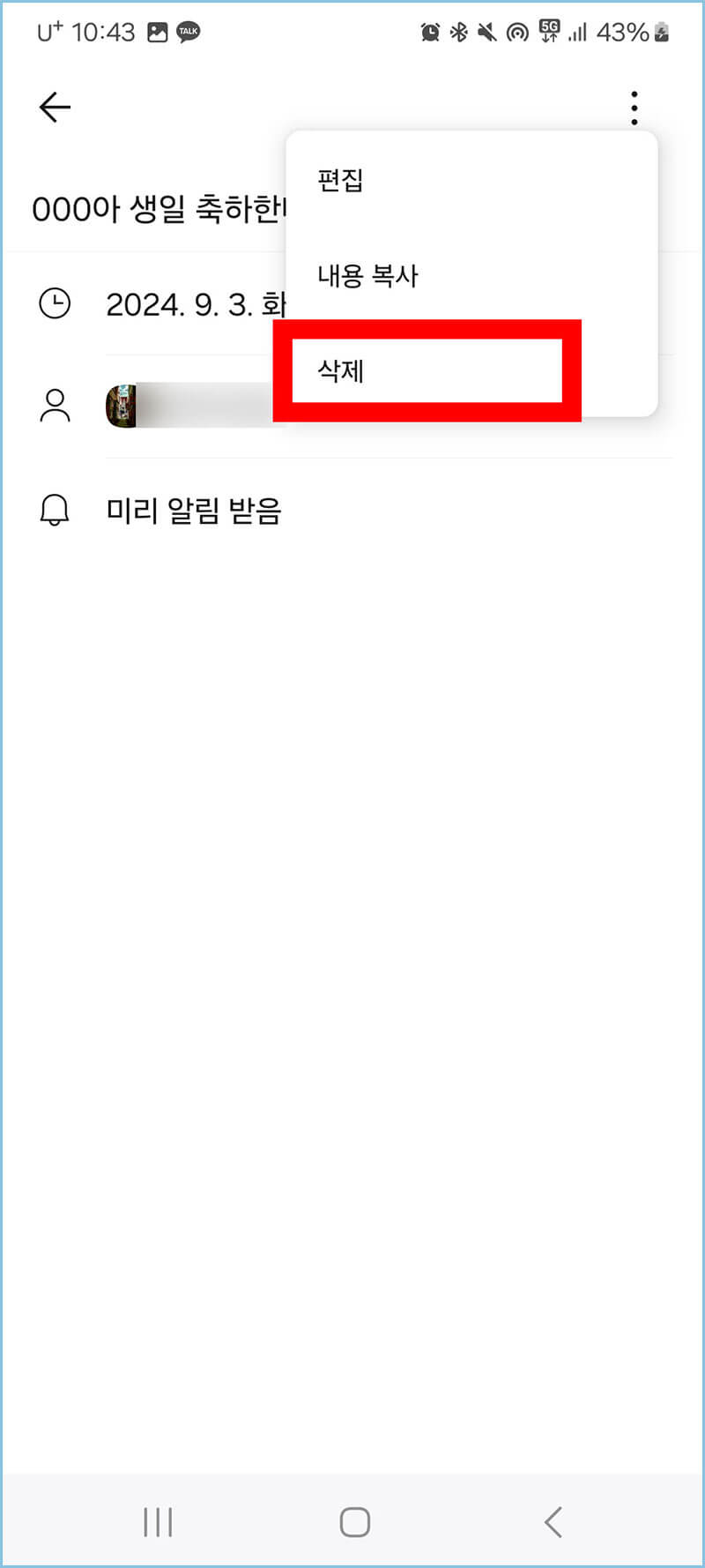07. 그러면 화면 전환이 됩니다. 이 상태에서 위에 있는 '삼점'을 눌러주세요. 편집, 내용복사, 삭제 순으로 나옵니다. 만약 취소할 분들은 '삭제' 버튼을, 변경하실 분들은 '편집'을 눌러주시면 됩니다.