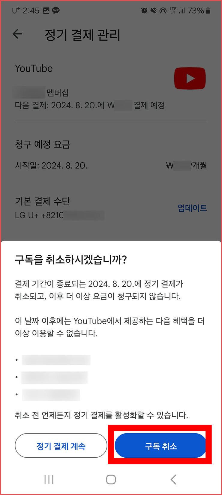 10. 마지막으로 한 번 더 하단에 있는 파란색 버튼인 '구독 취소'를 눌러주시면 됩니다. 구독 취소를 한다고 해서 채널의 구독이 취소되는 게 아니라 해당 채널의 멤버십 및 회원전용이 취소 해지되는 것 입니다.