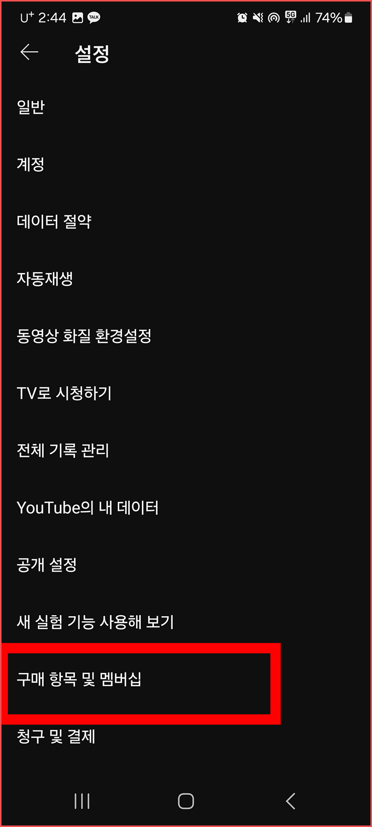 04. 설청창이 나왔습니다. 여기서 중간에 위치한 '구매 항목 및 멤버십'이라는 글자가 보입니다. 해당 탭을 눌러주세요.