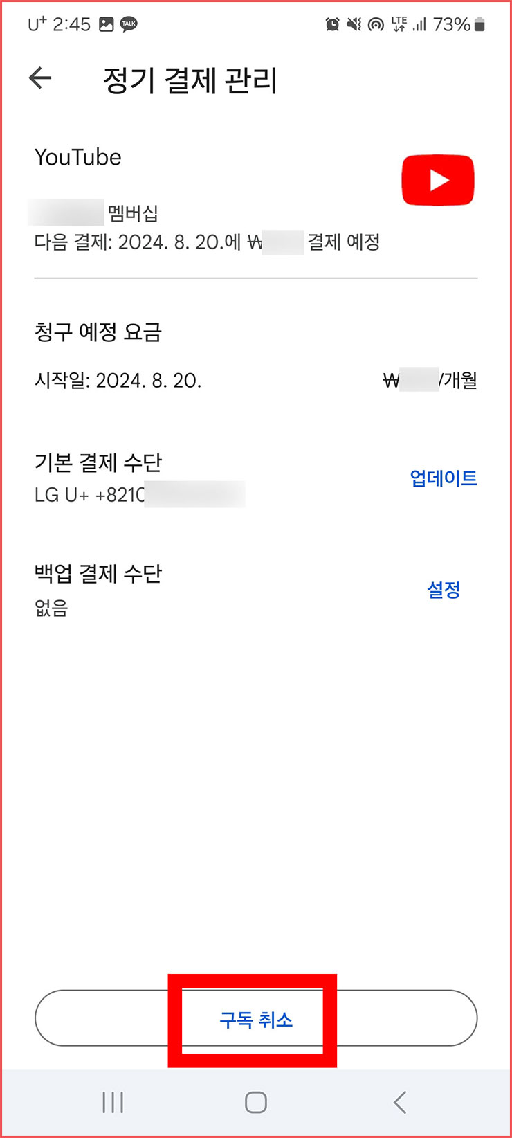 08. 정기 결제 관리창이 나옵니다. 근데 생각해보면 왜 정기 결제인지 모르겠네요. 이번 달만 이용하면 되지, 그냥 자동으로 다음 달 결제도 해놓게 했으니 말이죠. 멤버십 회원전용을 취소 해지 할 거니까, 하단에 있는 '구독 취소'를 눌러주세요.