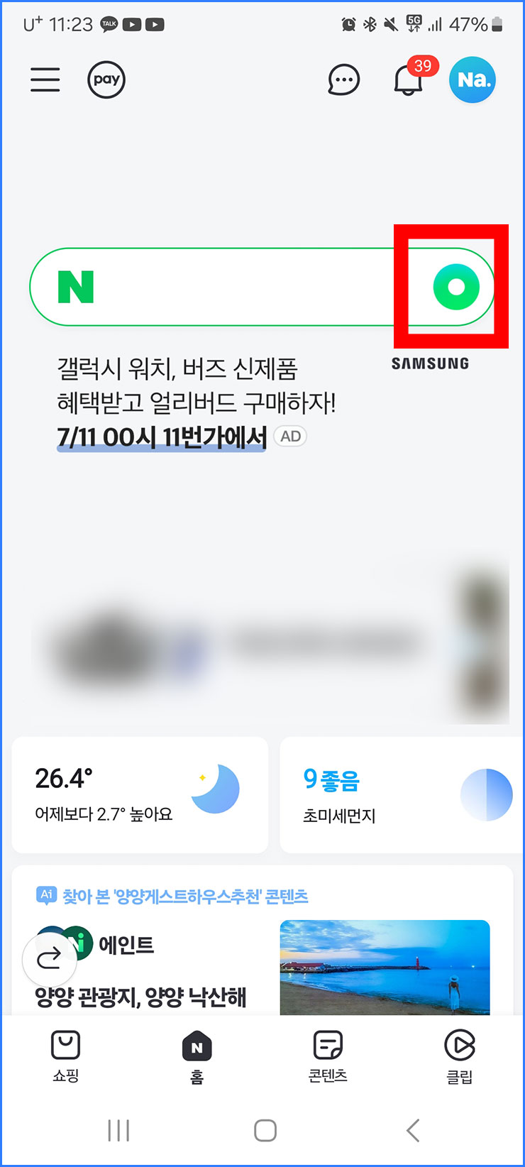 02. 네이버 앱을 들어가면 아래와 같이 나옵니다. 그 상태에서 중간에 위치한 '초록색 동그라미'를 눌러주세요.