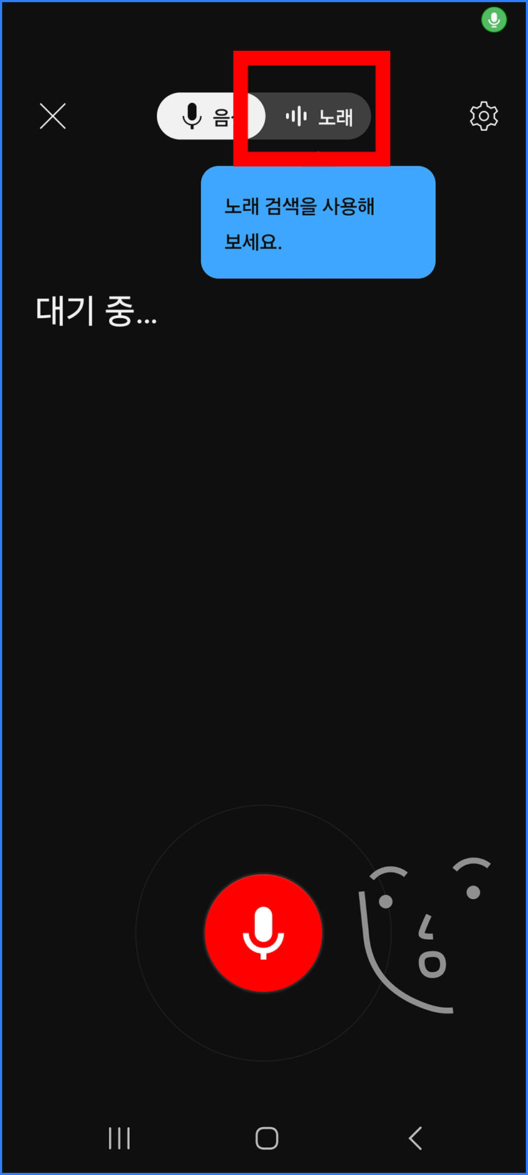 09. 처음에는 음성으로 설정이 되어 있습니다. 우리는 카페에서 나오는 노래를 음으로 찾는 것이기 때문에, 이 상태에서 '노래' 글자를 눌러서 설정을 바꿔주세요.