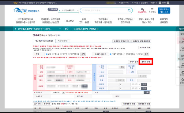 ▣ '거래처명'을 작성한 다음에 '조회하기'를 눌러주세요.