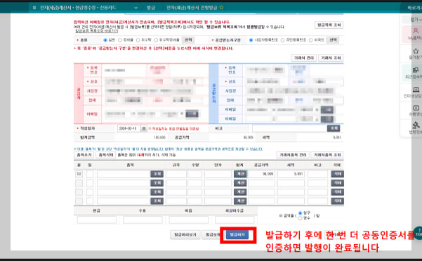 ▣ 마지막으로 '발급하기'를 누르고 '공동인증'을 한 번 더 하면 끝이 납니다. 이제 원래 거래처에서 전자 세금계산서 발급하는 법을 알아보겠습니다.