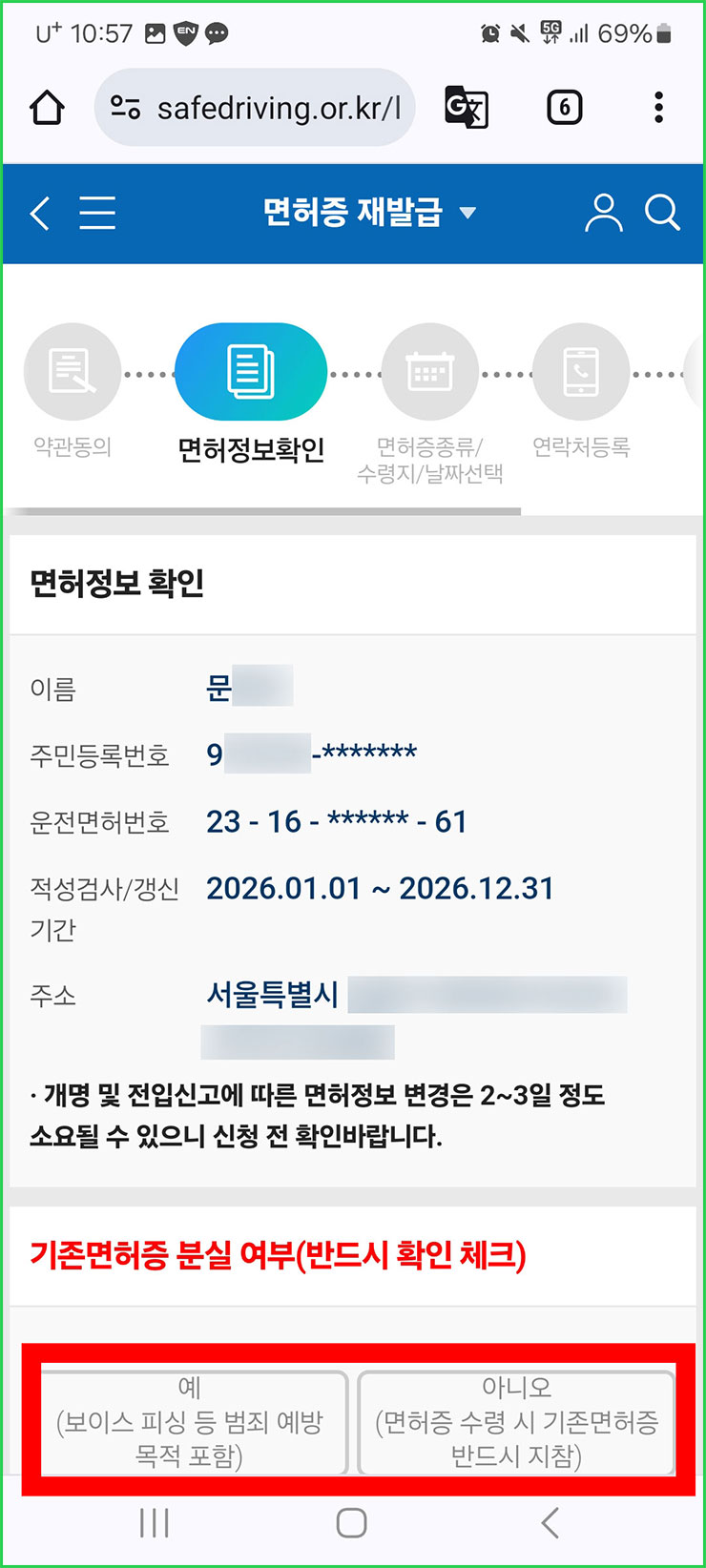 10. 면허정보확인에서 '예 또는 아니오'를 선택해주세요. 저처럼 기존에 있던 운전면허증을 잃어버리신 분들은 '예'를, 아니라면 '아니오'를 눌러주세요. 그 다음에는 아래에 있는 '확인'에 체크를 해주세요.
