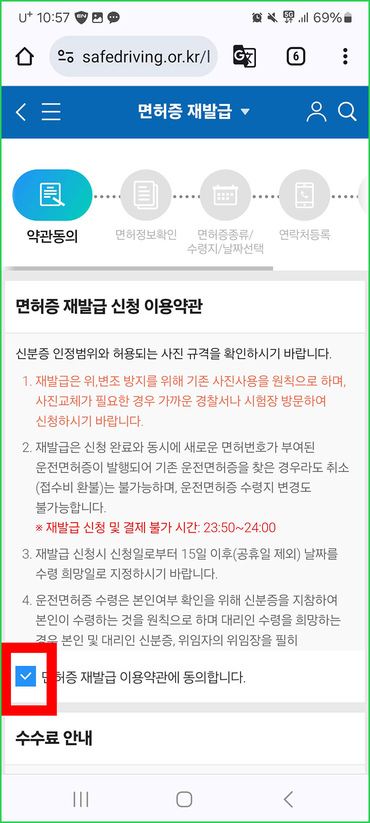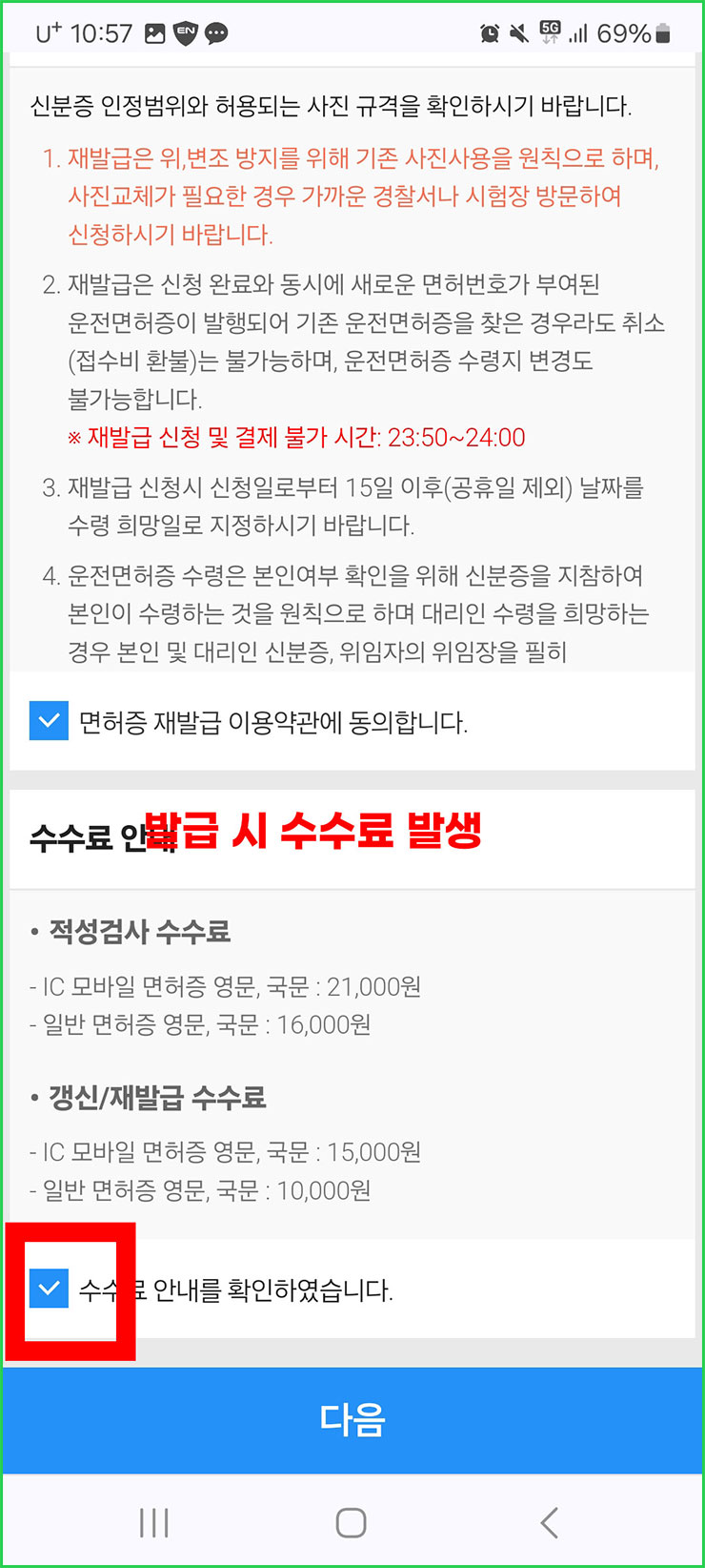 09. 이제 '이용약관 동의'에 체크를 한 다음에, '수수료 안내 확인'에 체크를 해주세요. 수수료는 처음 발급하는 것과 재발급하는 것에 따라서 가격이 다릅니다. 만약에 여러분들이 저처럼 처음 발급하는 경우에는 21.000원 비용이 나옵니다. 재발급/갱신의 경우에는 15,000원입니다.