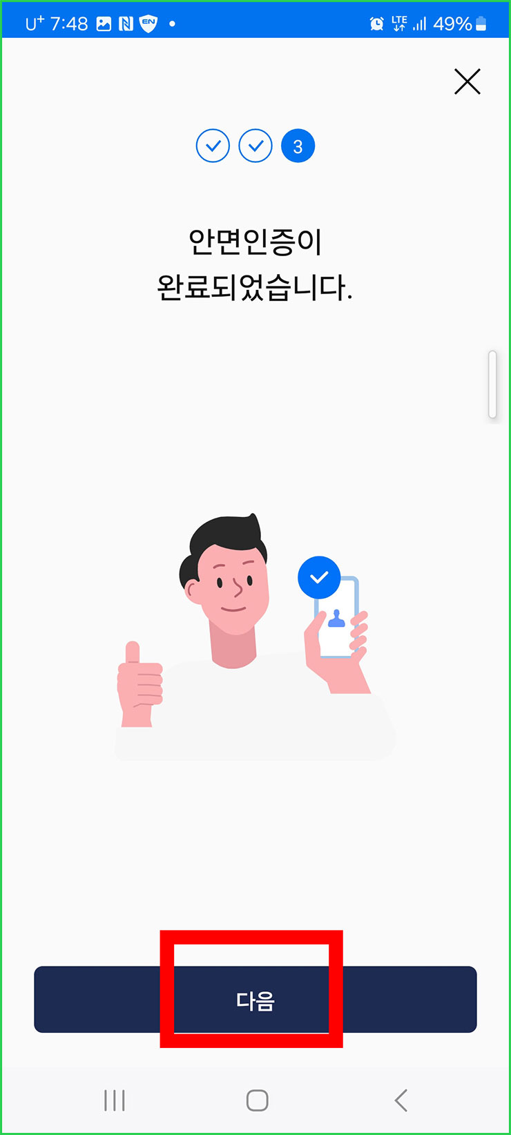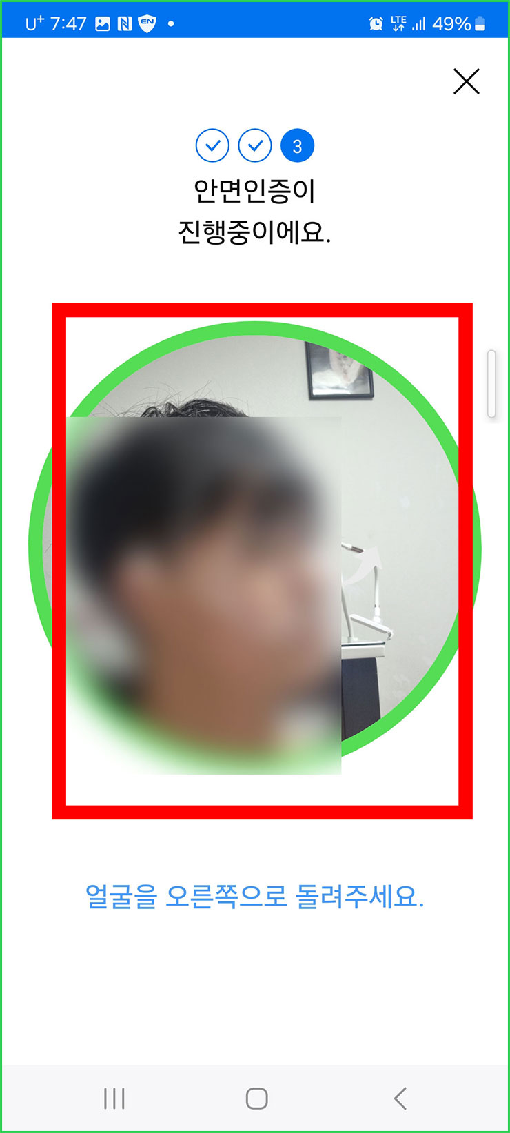 21. 이제 여러분들의 '안면인증'을 해주세요. 앞, 오른쪽, 왼쪽으로 총 세 번을 합니다. 그 다음에는 '다음'을 눌러주세요.