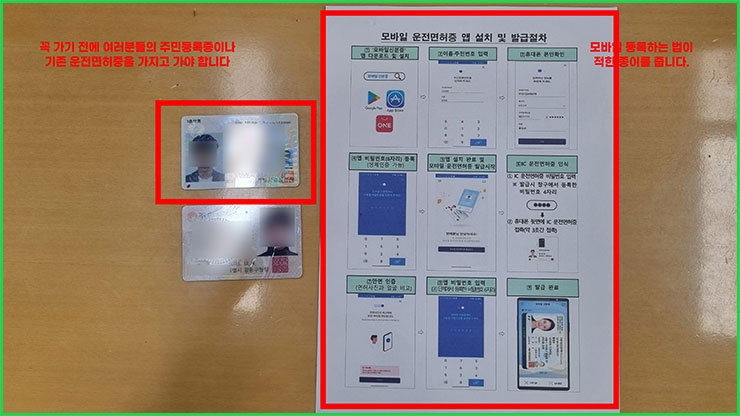 14. 저는 제 집 근처 경찰서에서 IC 운전면허증을 받았습니다. 여기서 주의해야 할 점은 IC 운전면허증을 받기 위해서는 '실제 주민등록증 또는 기존 면허증'을 지참해야 합니다. 꼭 지참하셔야 합니다.