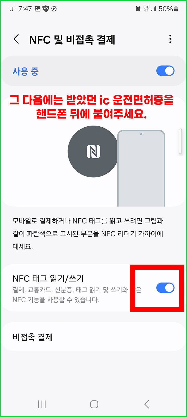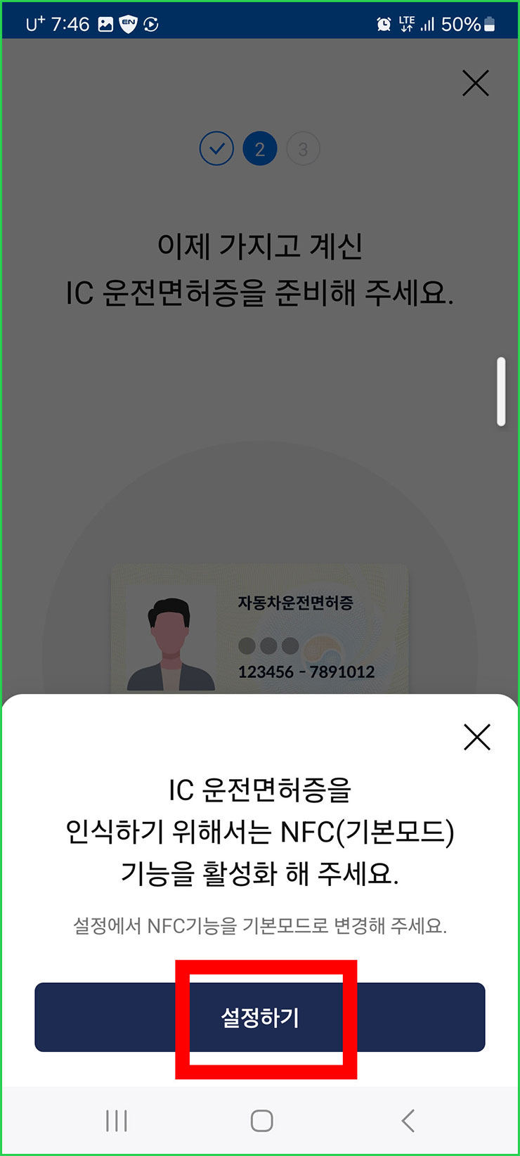 19. 아래와 같은 창이 나왔으면 '설정하기' 버튼을 눌러주세요. 그러면 NFC 및 비접촉 결제 창이 나옵니다. 처음 보는 창이라도 걱정 안 하셔도 됩니다. 밑에 있는 'NFC 태크 읽기/쓰기'에 버튼을 활성화해주세요. 그리고 여러분들 휴대폰 뒤로 IC 운전면허증을 갖다대주세요.'
