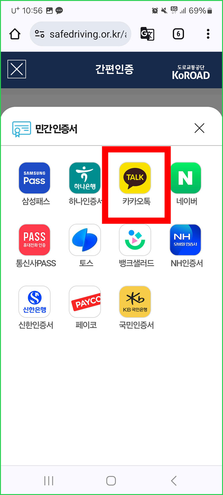 08. 그 다음에는 '카카오톡' 어플 모양을 선택해주세요. 그 다음에는 여러분들의 '개인 인증톡'으로 메세지가 하나 옵니다. 메세지에서 인증을 누른 다음에 아래 화면에 있는 '인증하기'를 한 번 더 눌러주세요.