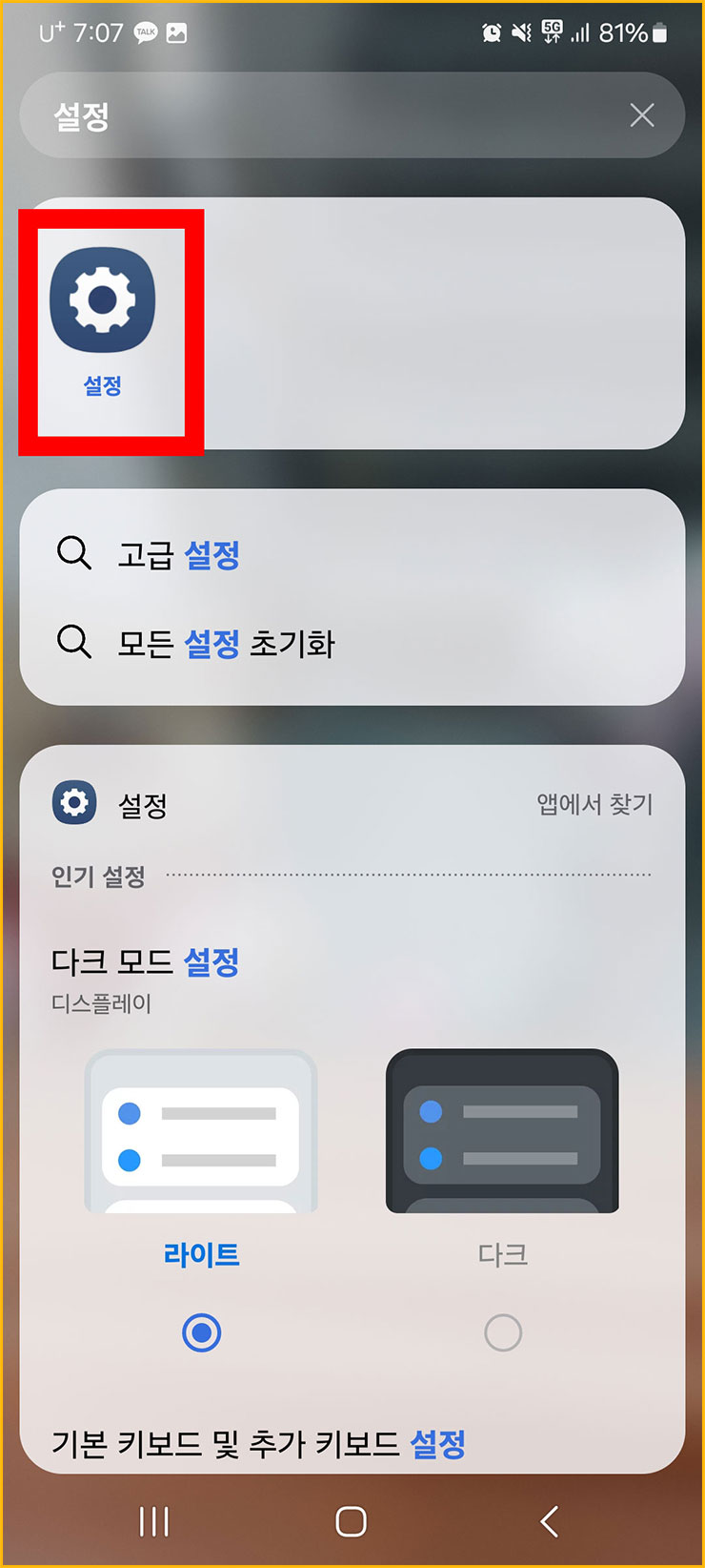 02. 검색창에 설정을 검색하면 아래와 같이 '설정' 어플이 나옵니다. 설정 어플을 선택해주세요.