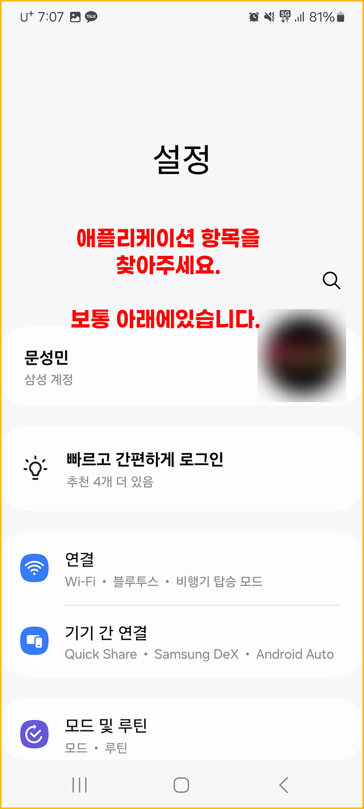 03. 설정창에 들어오면 보통 아래와 같은 화면이 나옵니다. 여기서 애플리케이션 항목을 찾아야 합니다. 보통 조금 아래에 있더라고요.