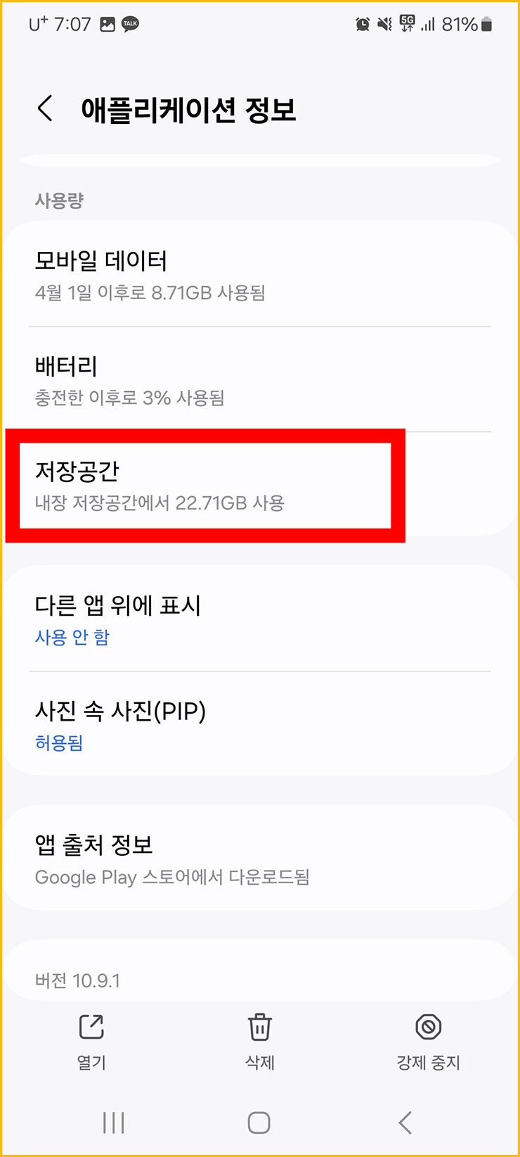08. '저장공간'이라는 항목을 찾았습니다. 해당 항목을 선택해주세요. 해당 앱에서 얼마큼 저장공간을 쓰고 있는지 아래 작은 숫자로 나와있는 걸 확인할 수 있습니다.