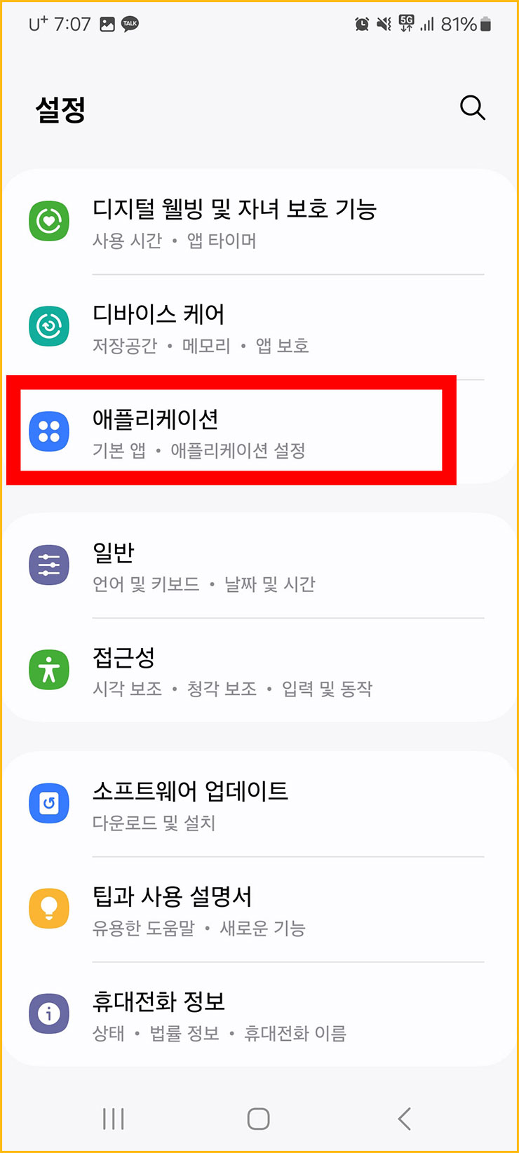 03. 설정창에 들어오면 보통 아래와 같은 화면이 나옵니다. 여기서 애플리케이션 항목을 찾아야 합니다. 보통 조금 아래에 있더라고요.