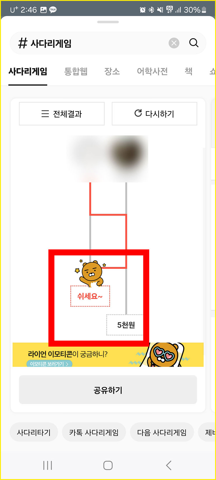 06. 톡방에 사다리타기 톡이 올라온 것을 확인할 수 있습니다. 이 상태에서 톡 안에 있는 '전체 결과 확인하기'를 눌러주세요