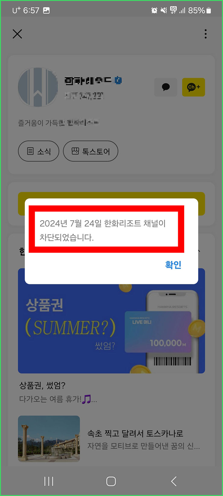 05. 아래와 같은 알람이 나왔으면 해당 채널에 대한 카톡 광고는 차단이 되었습니다. 이제 다른 방법을 알아보겠습니다.