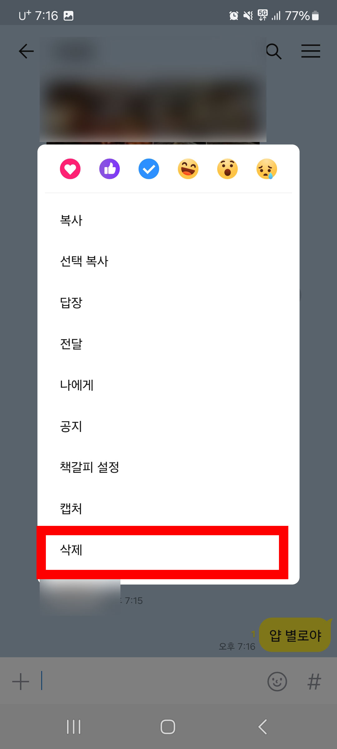 08. 그 다음에는 위에처럼 '지우고 싶은 메세지'를 길게 눌러주세요.