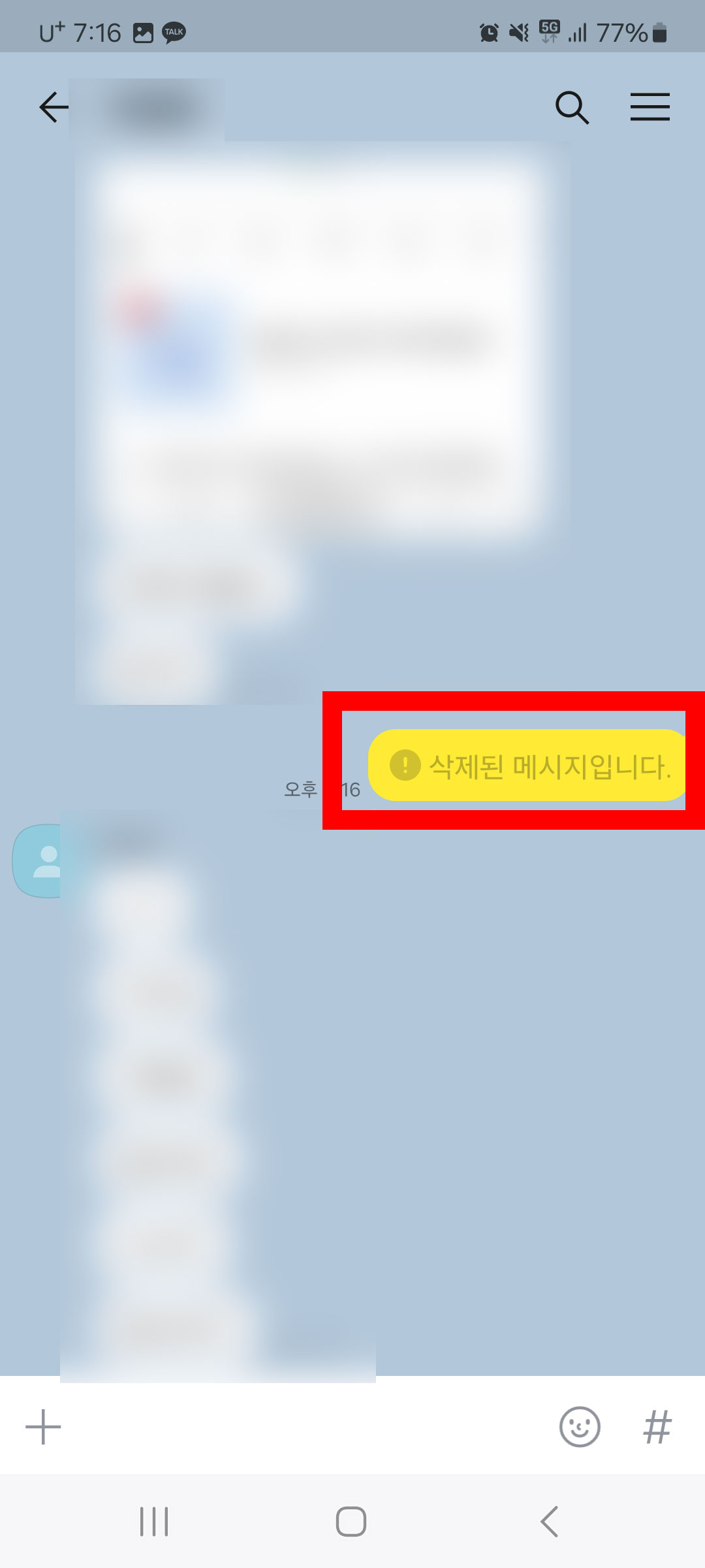 06. 삭제가 완료되었으면 아래처럼 '삭제된 메세지입니다.'라는 문장이 나옵니다. 여기까지 했으면 카톡 메세지 삭제하기는 완료가 되었습니다.