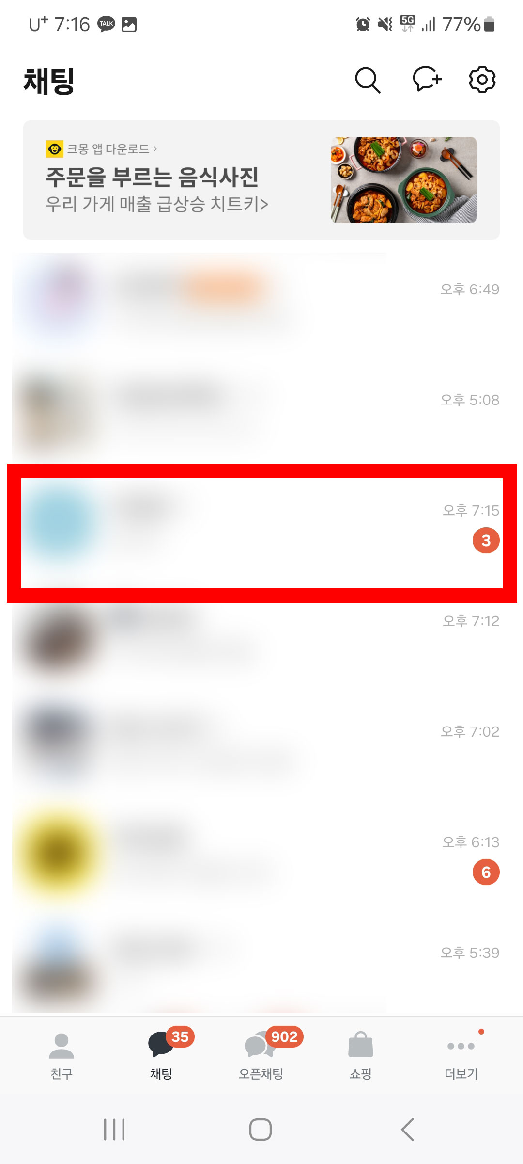 01. '지우고 싶은 메세지가 있는 톡방'에 들어가주세요. 저도 여러분들께 설명해드리기 위해서 임의의 톡방을 하나 들어가보겠습니다. 이미 톡방에 들어가신 분들은 그 다음 단계로 진행을 해주세요.