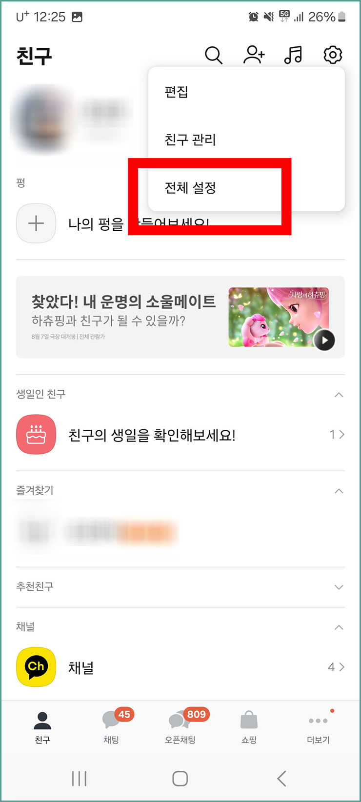 02. 아래와 같은 창으로 와주세요. 아래와 같은 창으로 가기 위해서는 하단에 있는 '친구 아이콘'을 클릭하면 아래와 같은 창이 나옵니다. 이 상태에서 우측 상단에 있는 '톱니바퀴' 모양을 눌러주세요.