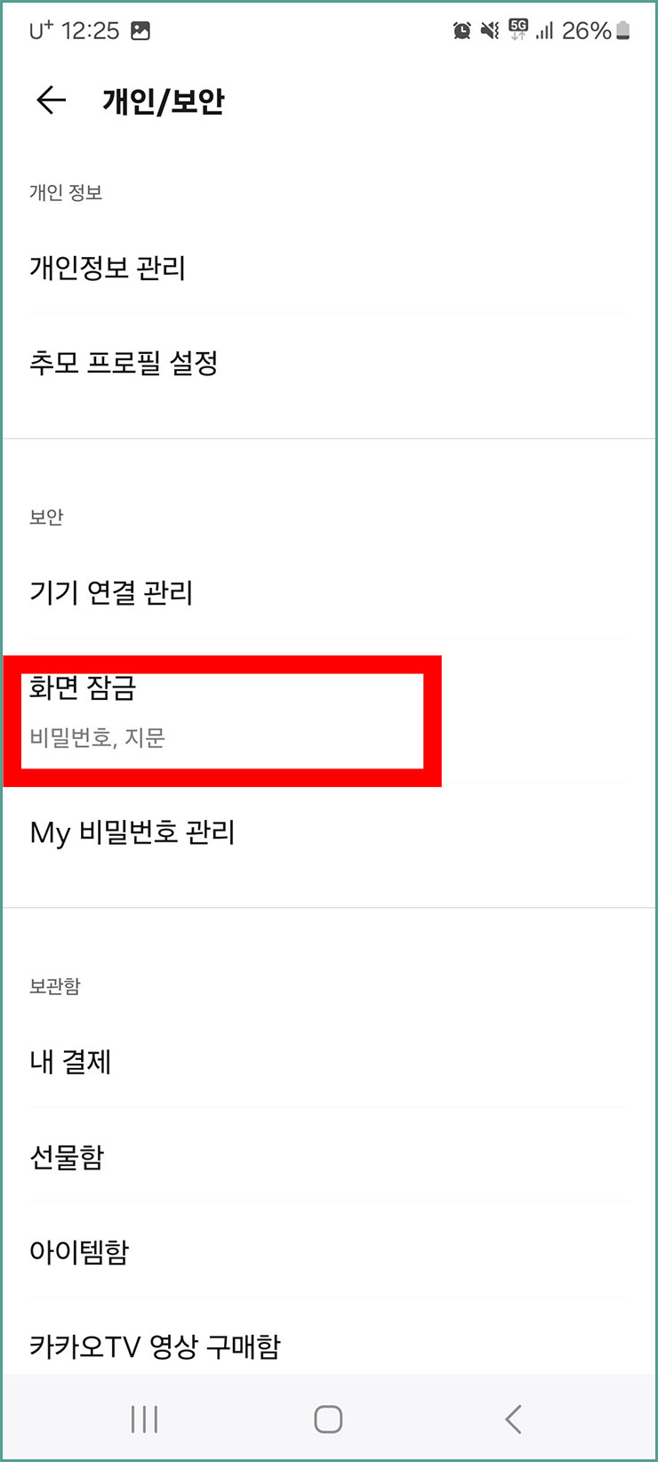 05. 개인 보안 창이 나오면 중간에 있는 '화면 잠금'으로 가주세요.