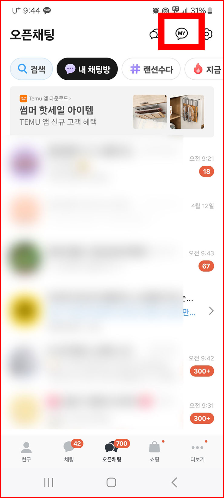 03. 오픈채팅창이 나오면 우측 상단에 있는 'MY' 기호를 눌러주세요.