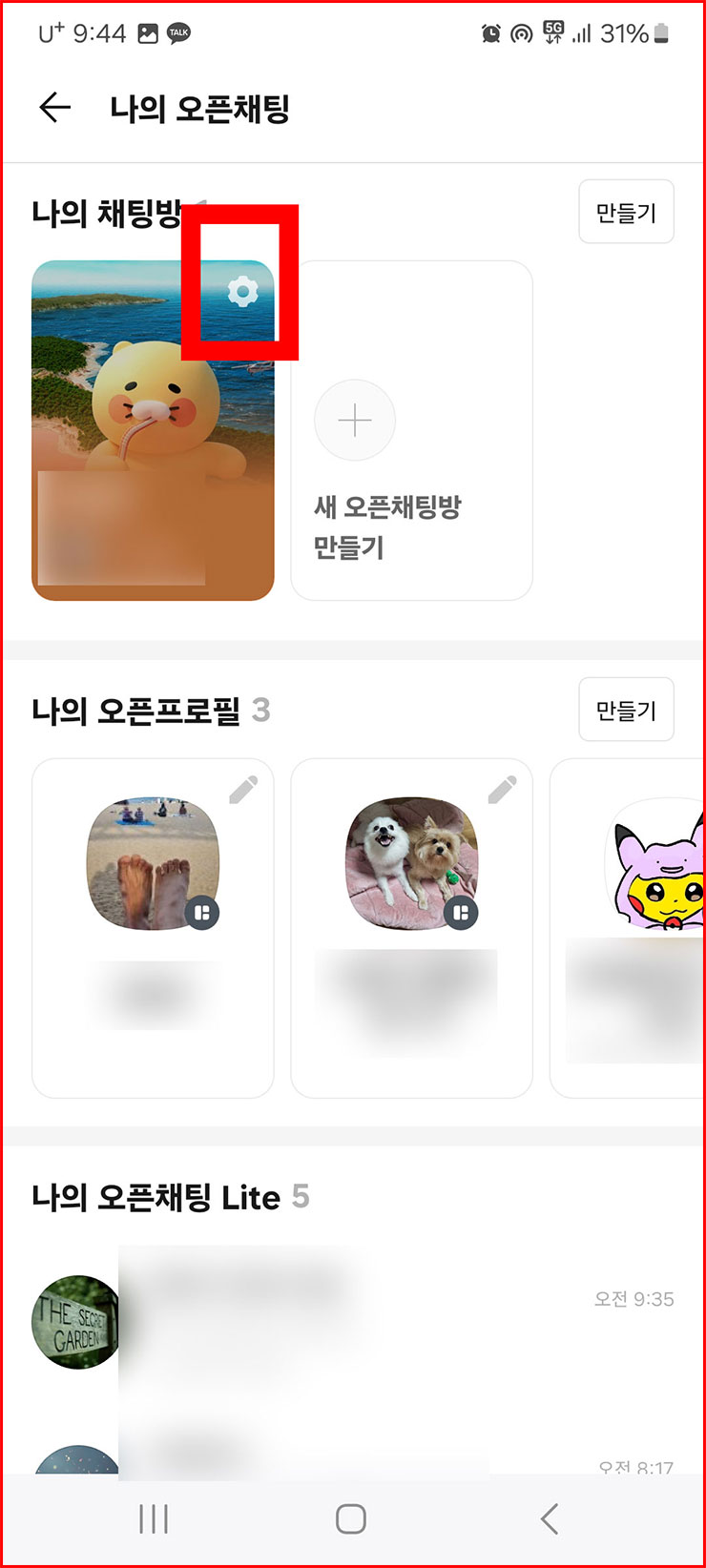 04. 그러면 나의 오픈채팅 관련 페이지가 나옵니다. 이 상태에서 제가 사진에 표시한 '톱니바퀴' 기호를 눌러주세요.