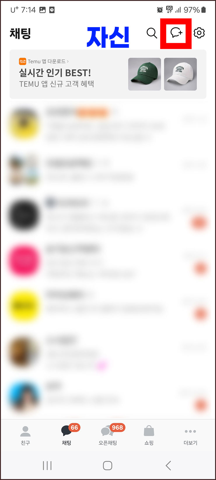 03. 이제 본격적으로 카톡 차단 확인 방법을 진행해보겠습니다. 여러분들의 '자신의 톡'으로 넘어와주세요. 그 상태에서 '채팅 페이지'에 우측 상단에 있는 '카톡 +' 기호를 선택해주세요.