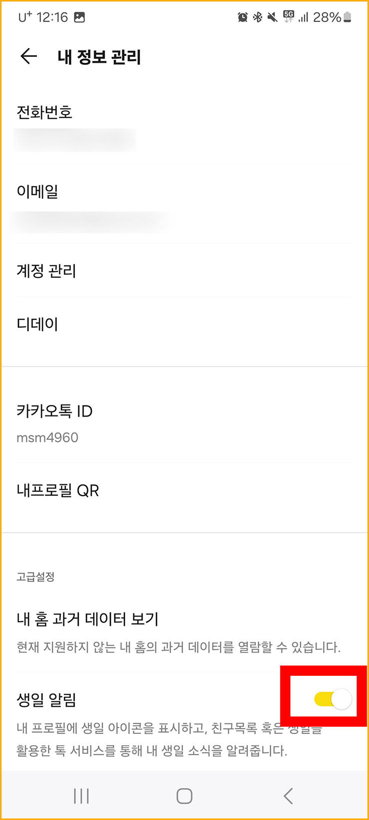 13. 내 정보 관리 창이 나옵니다. '생일 알림' 이라고 적혀 있는 부분을 버튼을 켜주세요.