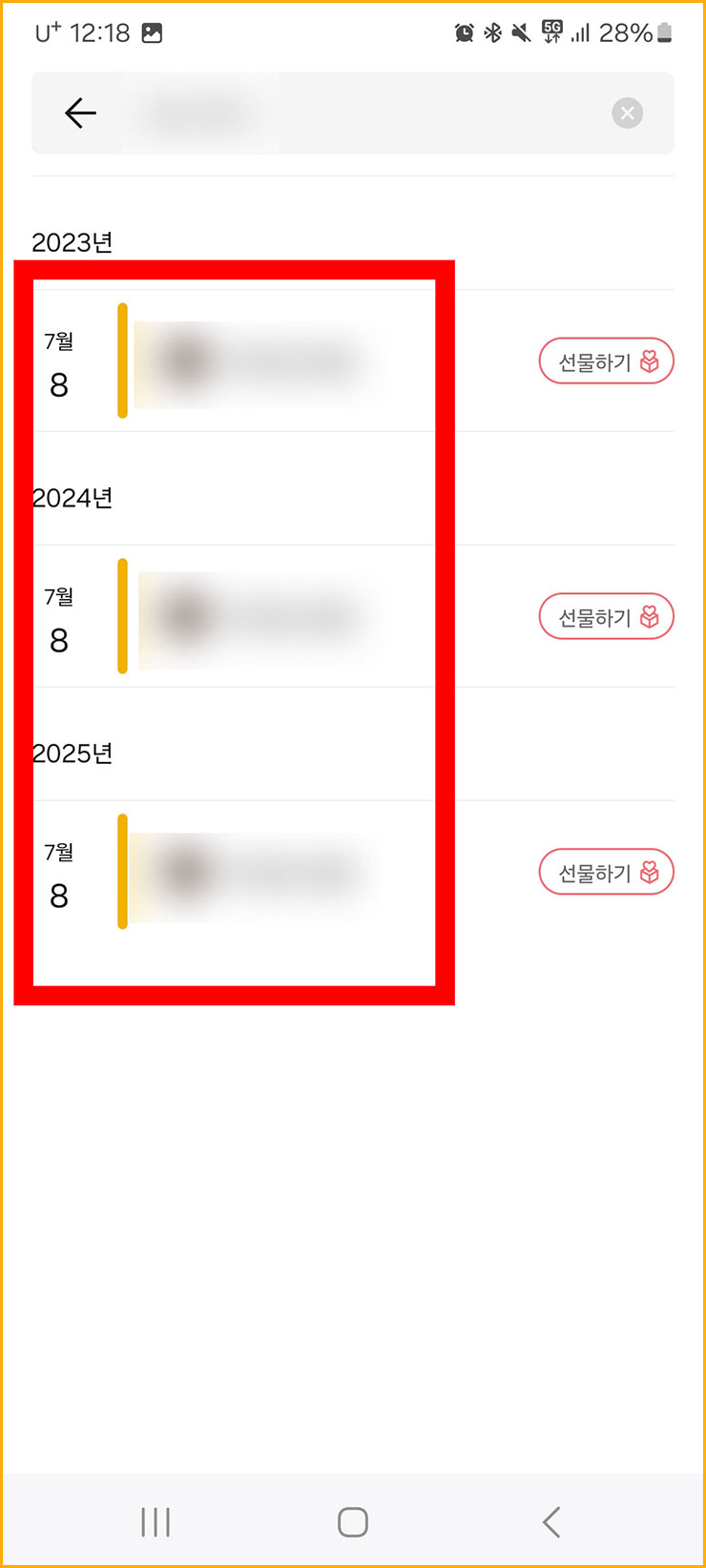 04. 이 중에서 친구 한명을 선택해보겠습니다. 이렇게 선택을 하면 친구의 이름이 나오면서 옆에 선물하기 기호가 나옵니다. 여기서 선물하기를 바로 할 수 있습니다.