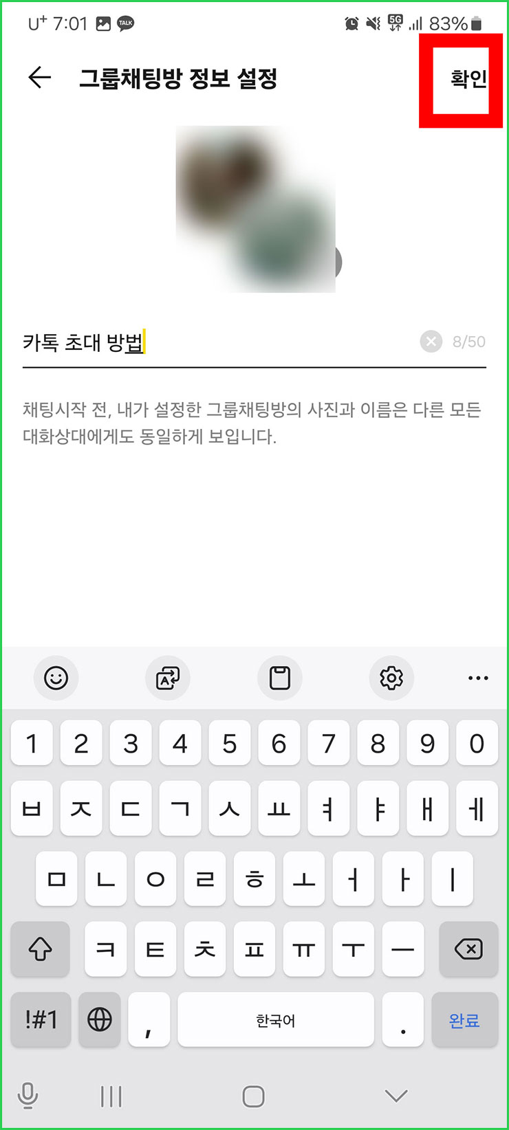 09. 단톡방명을 정했으면 우측 상단에 있는 '확인'을 눌러주세요.