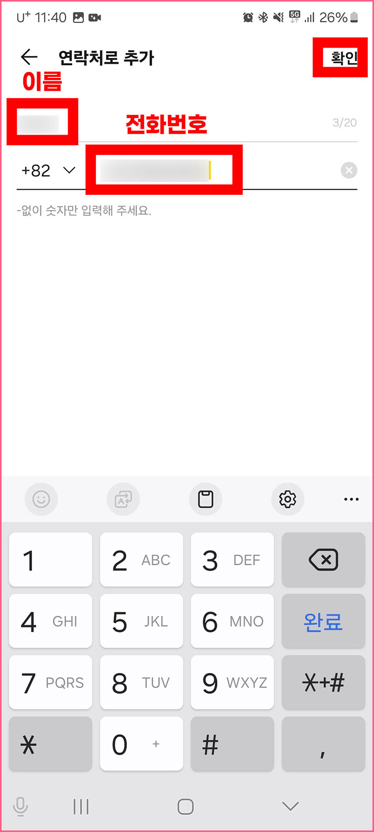11. '상대방의 이름'과 '전화번호'를 입력한 다음에 우측 상단에 있는 '확인'을 눌러주세요.