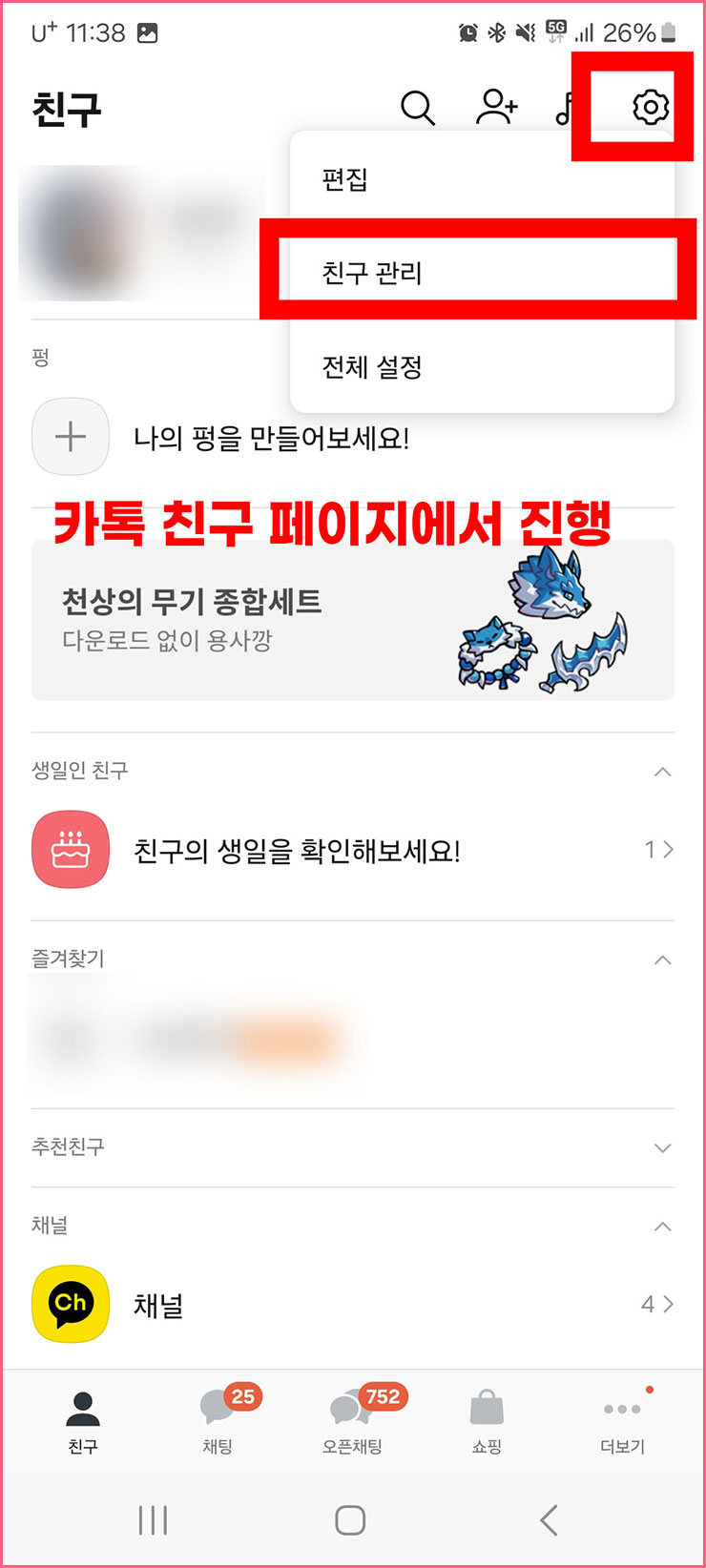 04. 그 다음에 '카카오톡'에 들어와주세요. 그 다음에는 '친구 페이지'에서 우측 상단에 있는 '톱니바퀴'를 눌러주세요. 그리고 두 번째에 있는 '친구관리'를 눌러주세요.