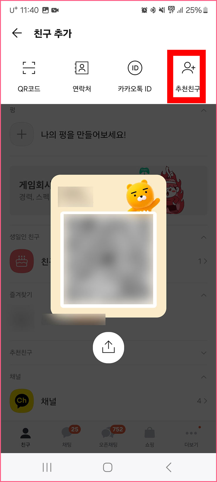 14. 이 방법은 조금 특이합니다. 상대방이 나를 자신의 카톡의 추가를 했는데, 여러분들은 추가 안 했을 수도 있잖아요. 그럴 때 사용하는 방법입니다. '추천 친구'를 눌러서 들어가주세요.