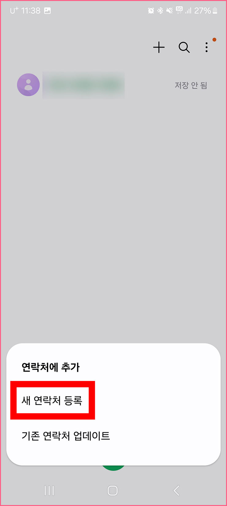 02. 플러스 버튼을 누르면 새 연락처 등록 / 기존 연락처 업데이트가 나옵니다. 우리는 새로운 사람을 등록하는 것이기 때문에 '새 연락처 등록'을 눌러주세요.