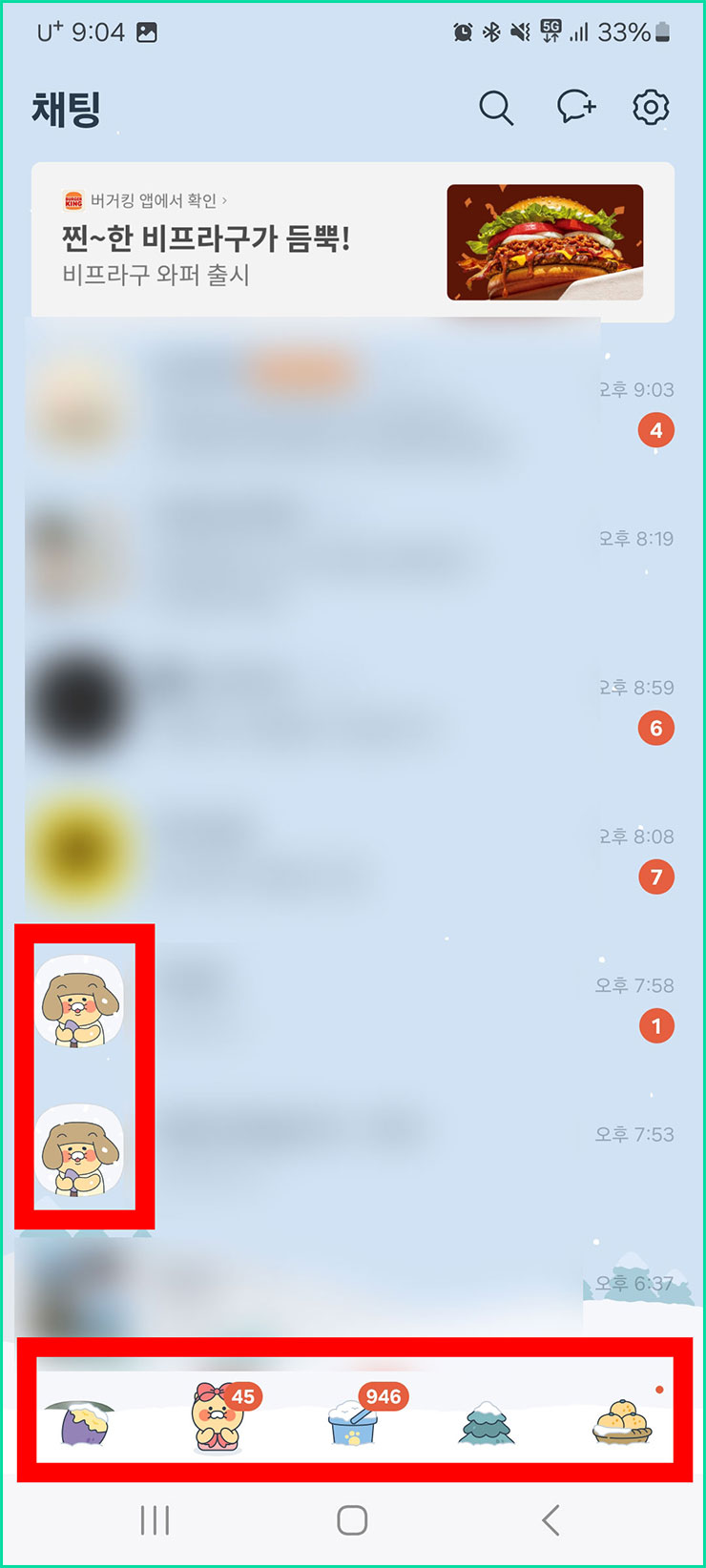 09. 아래 사진처럼 곳곳에 춘식이 캐릭터가 보입니다. 저는 춘식이 겨울 테마라서 약간 겨울 느낌나게 설정이 되었습니다. 그리고 친구의 프사가 기본 프사로 되어 있을 경우에는 그 안에 춘식이 캐릭터가 들어가네요. 이건 좋은 거 같습니다.
