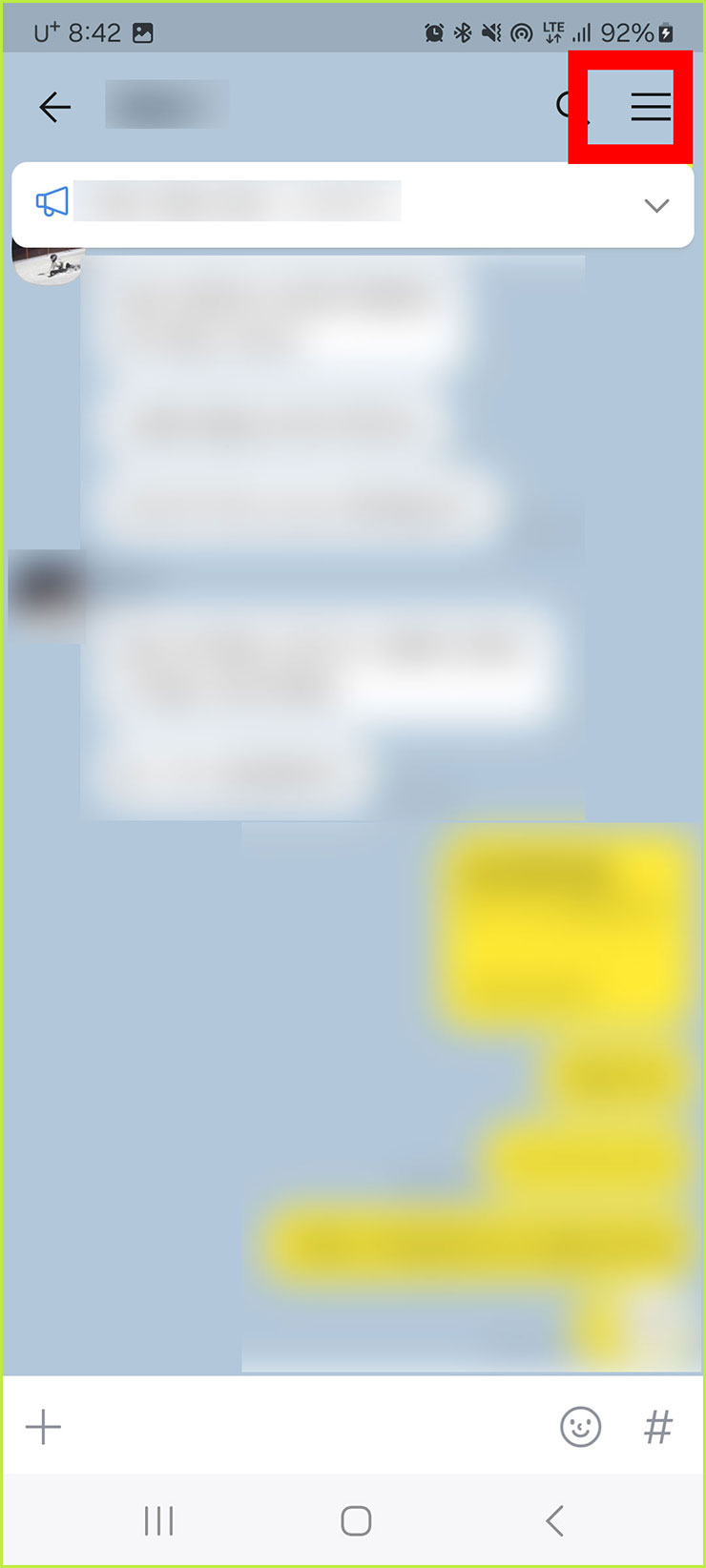 02. 톡방에 들어오면 우리가 흔히 보는 창이 나옵니다. 이 상태에서 우측 상단에 있는 ' 三 ' 모양을 선택해주세요.