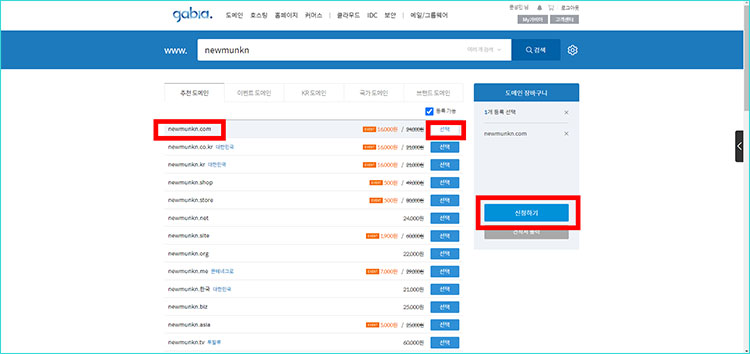 ▣ 저는 가장 위에 있는 'COM'을 선택한 다음에 '신청하기' 버튼을 눌렀습니다. 여러분들 상황에 맞는 금액과 도메인 주소로 선택해주세요.