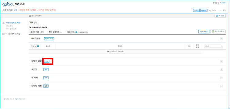 ▣ 이제 여러분들 구매한 가비아 주소가 보일 겁니다. 그 주소 옆에 있는 '설정' 버튼을 눌러주세요.