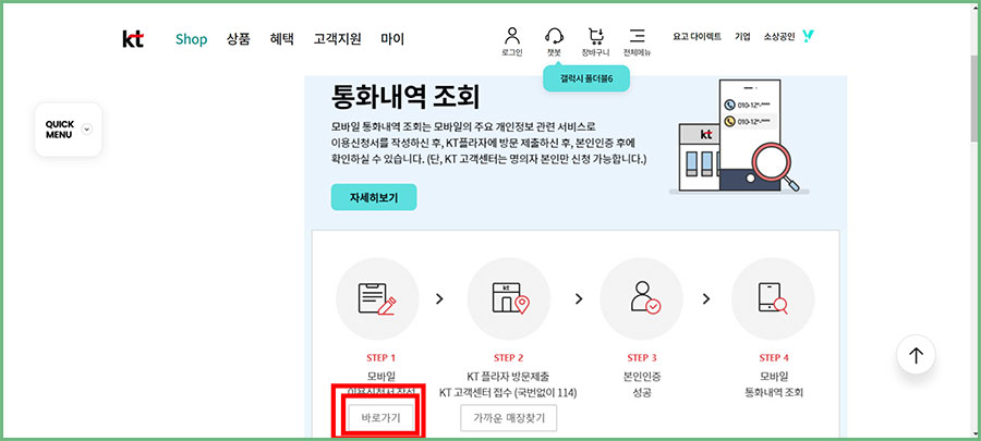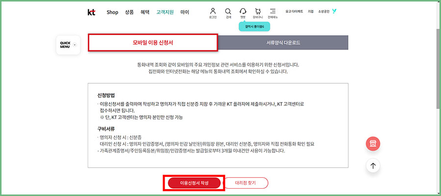 03. 통화내역 조회라는 창이 아예 나옵니다. KT 역시 신청서를 작성해야 합니다. 그렇기 위해서는 모바일 이용 신청서 작성 밑에 있는 '바로가기'를 눌러주세요.