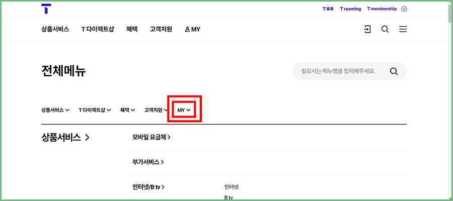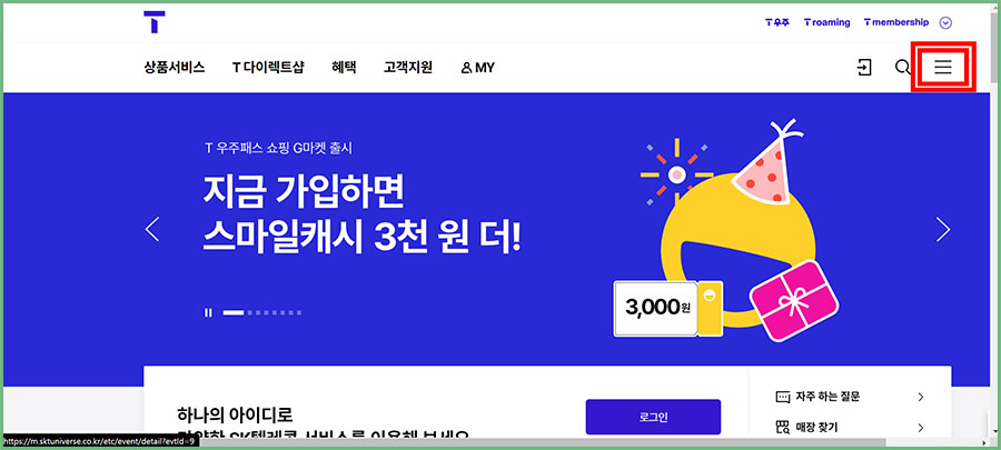 01. 위에서는 엘지에 대한 방법을 찾아봤다면 이제 SKT 방법에 대해서 알아보겠습니다. 'SKT T월드' 홈페이지로 들어와주세요. 그 다음에는 우측 상단에 있는 '三'을 눌러주세요.