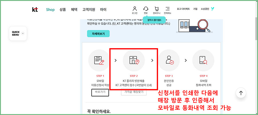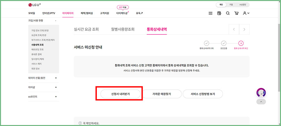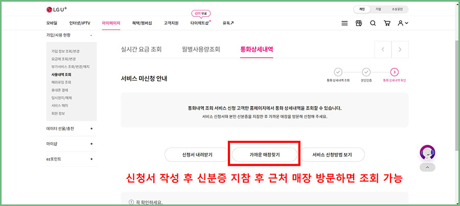 07. 그리고 인쇄된 신청 양식서를 가지고 '가까운 매장 방문'을 해서 승인을 받고, 모바일 통화내역 조회를 하면 됩니다.