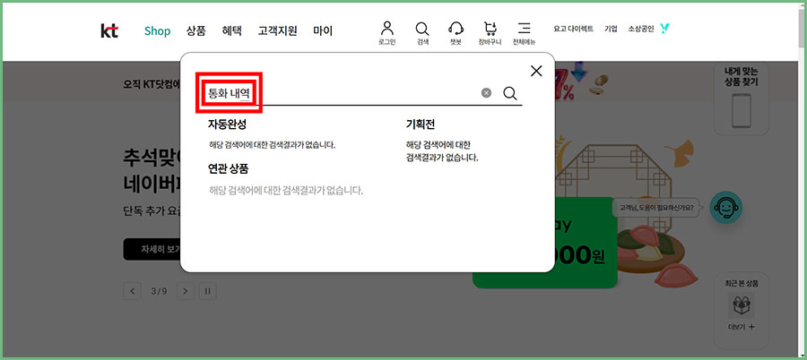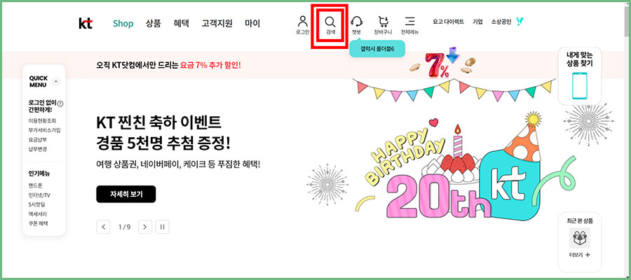 01. KT 역시 앞에 통신사들과 같이 'KT 홈페이지'로 와주세요. 그 다음에는 돋보기 아이콘이 있는 '검색'을 눌러주세요.