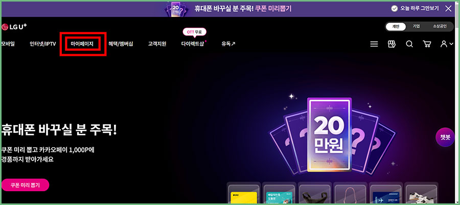 01. 먼저 엘지 유플러스부터 확인을 해보겠습니다. 엘지 유플러스 공식 홈페이지에 접속을 해주세요. 아래와 같이 메인 페이지가 나올 겁니다. 페이지 좌측 상단에 보면 '마이페이지'가 있습니다. 마이페이지 탭을 눌러주세요.
