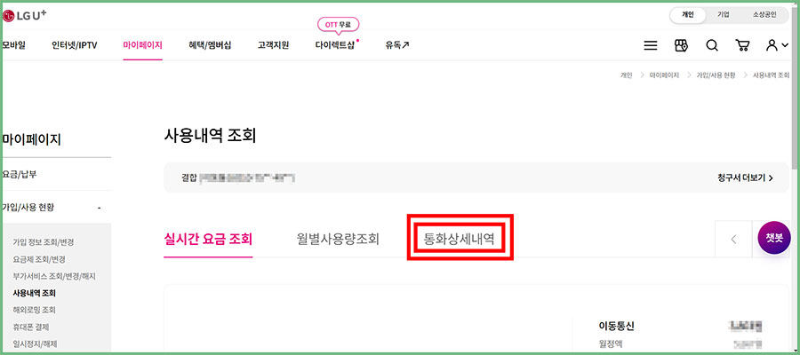 03. 사용내역 조회창이 나오면 크게 실시간 요금 조회 / 월별사용량조회 / 통화상세내역으로 나눠집니다. 이 중에서 우리가 필요한 '통화상세내역'으로 가주세요.