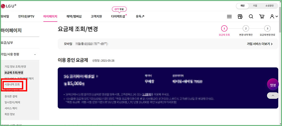 02. 아래와 같이 마이페이지로 넘어옵니다. 이 중에서 우리는 통화내역을 조회하기를 희망하기 때문에, 좌측에 있는 항목들 중에 '사용내역 조회' 항목을 눌러주세요.