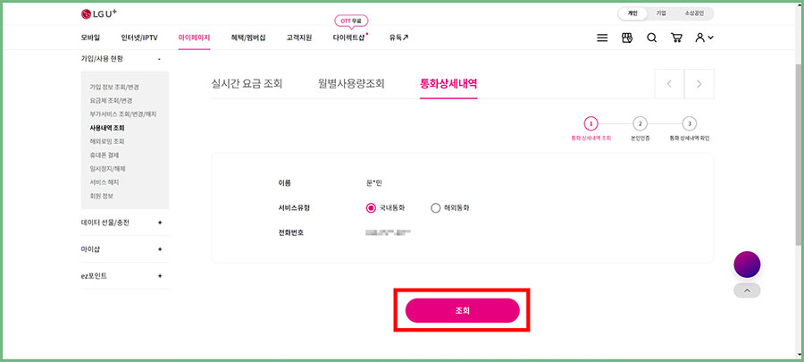 04. 여러분들의 이름, 서비스유형, 전화번호를 확인한 다음에 '조회'를 눌러주세요.